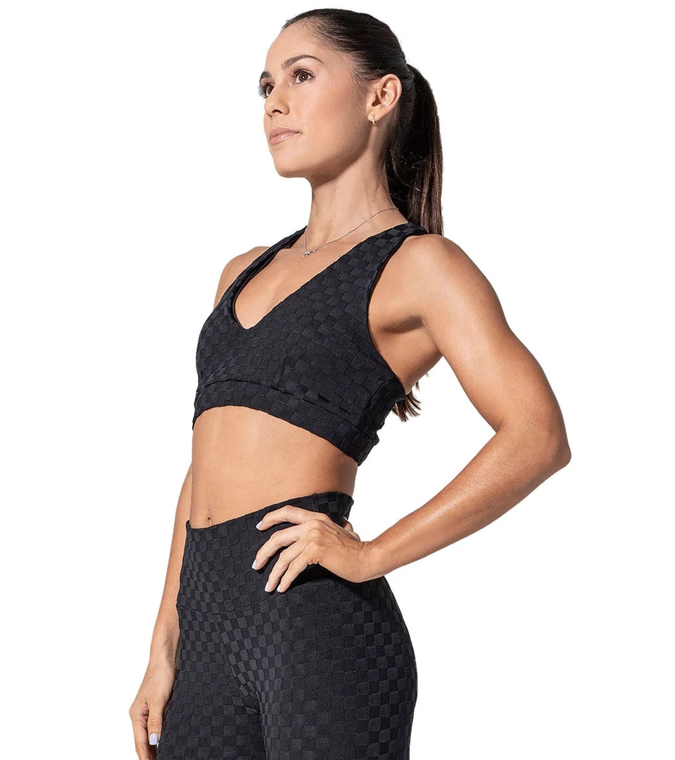 Be bold in the Spot Light Yoga Sports Bra. Has a classic, racerback design and a plunge neckline. Its stretch fabric flatters your physique while the anti-bacterical and odor free features keep you feeling fresh during your yoga practice.