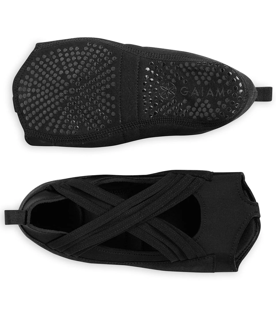 The Gaiam Grippy Studio Wraps are perfect for yoga, Pilates, barre, dance, and more. A step up from your typical yoga sock, the studio wraps are made with a more structured shoe-like design, providing ultimate support and grip. Grippy bottoms provide a non-slip surface on or off the mat, the open-toe design allows for a great tactile feel, and crossover straps offer a secure fit and unique style.