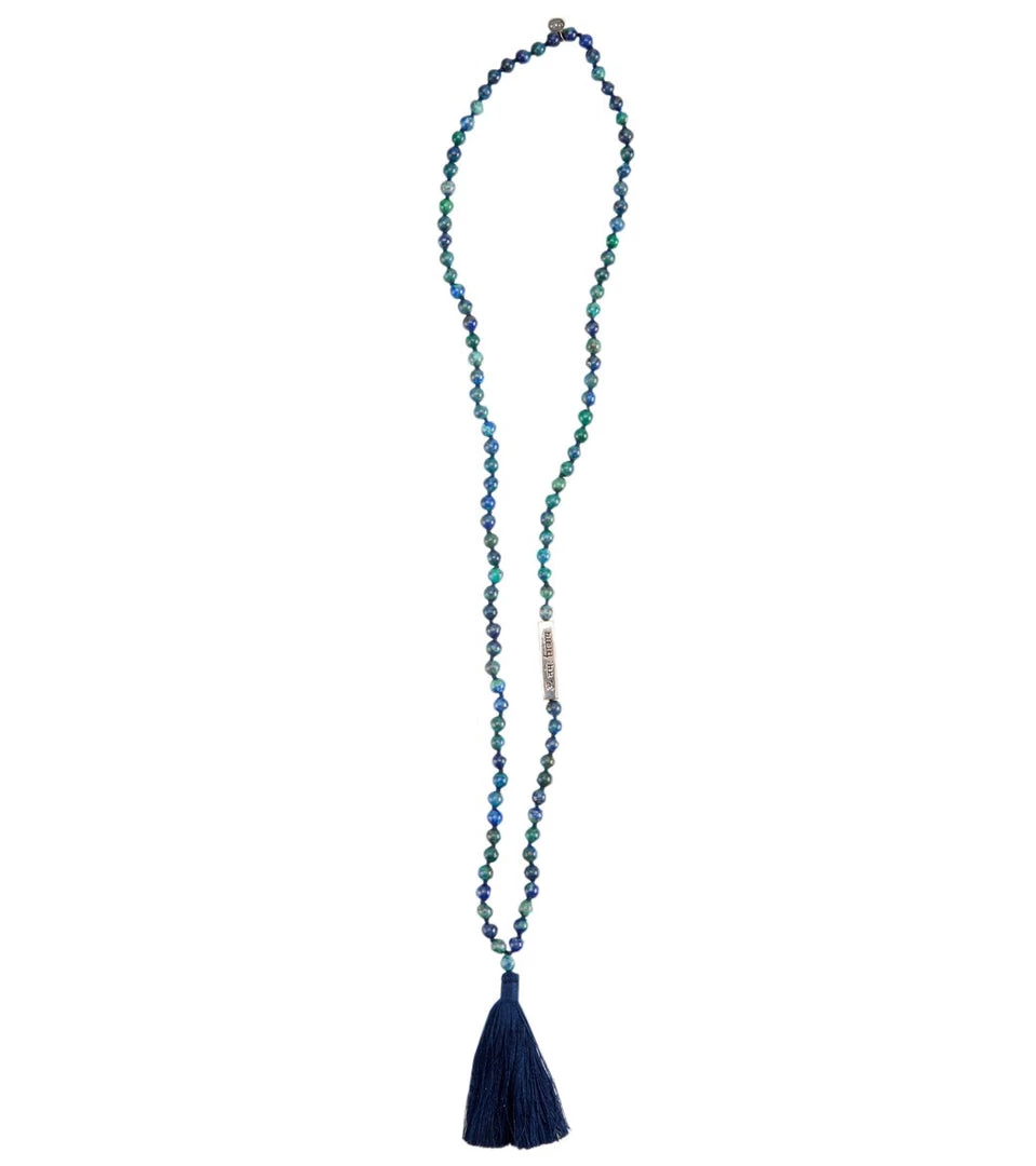 This beautiful combination of silver and obsidian gemstones in the Mala Collective Shiva Mala Necklace honors Shiva — the embodiment of pure consciousness, enlightenment, and destruction of ego. The Chrysocolla gemstones are known to increase the ability to love and understand others.