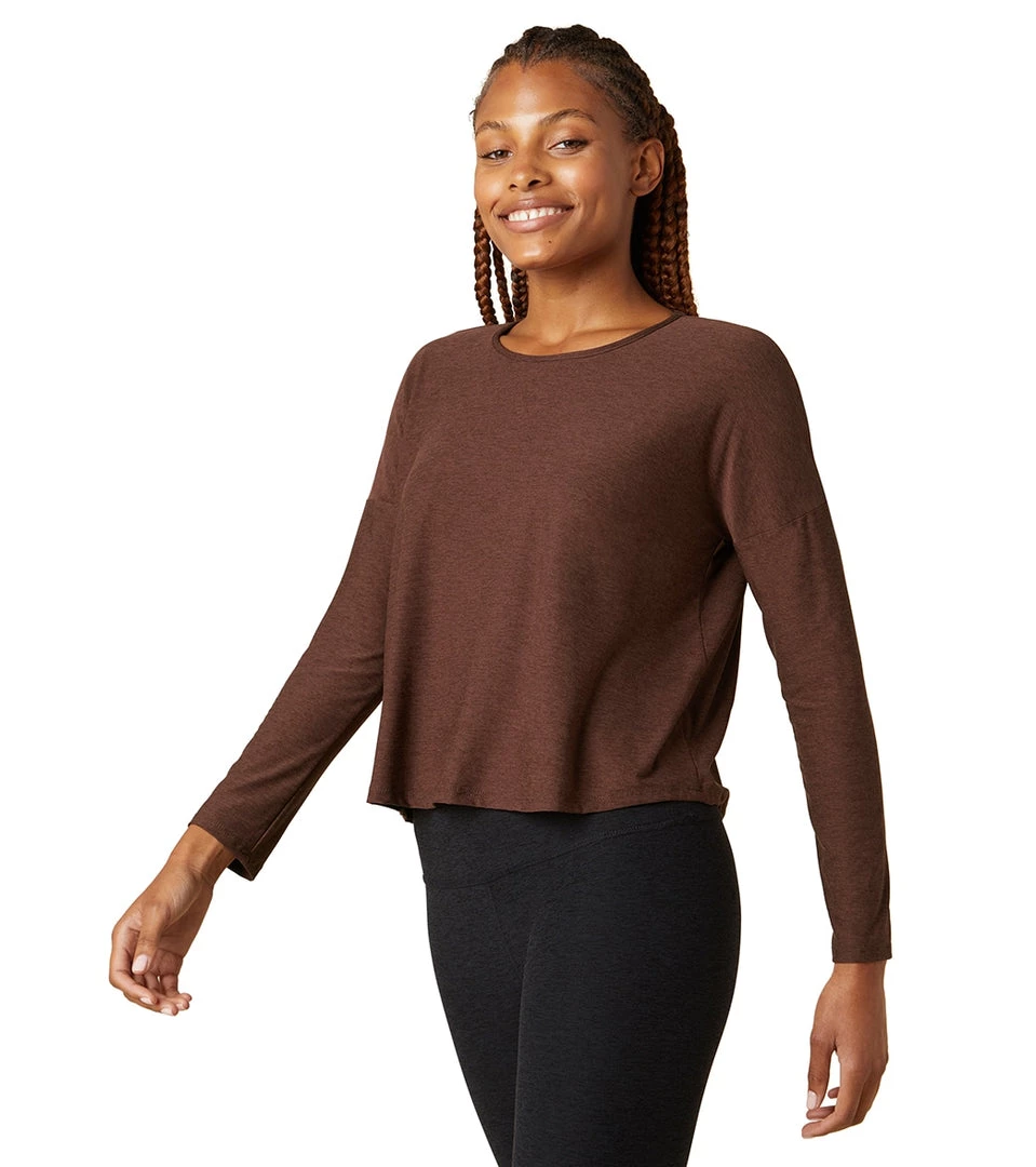 The Beyond Yoga Featherweight Morning Light Cropped Yoga Pullover is super soft and lightweight, perfect for morning hikes, afternoon practice, or evening walks.