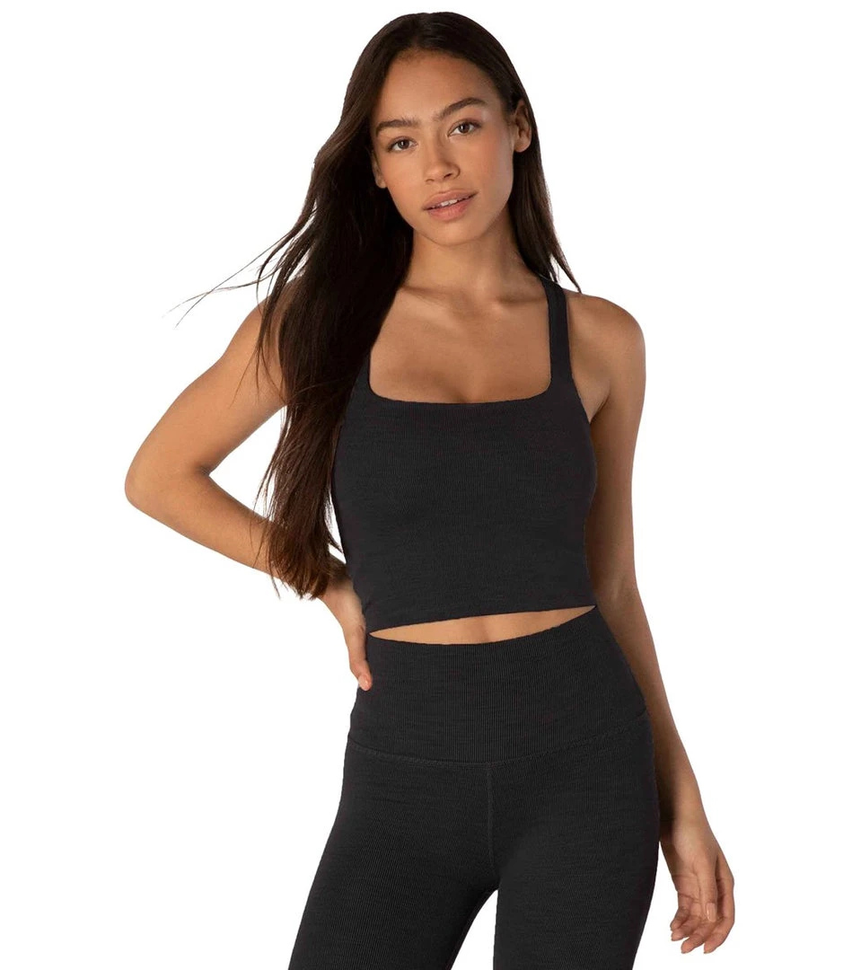Top of your favorite leggings with this Beyond Yoga Heather Rib Square Neck Cropped Yoga Tank Top, an ideal layering essential thanks to its soft, stretchy, ribbed fabric and stylish, square neckline.