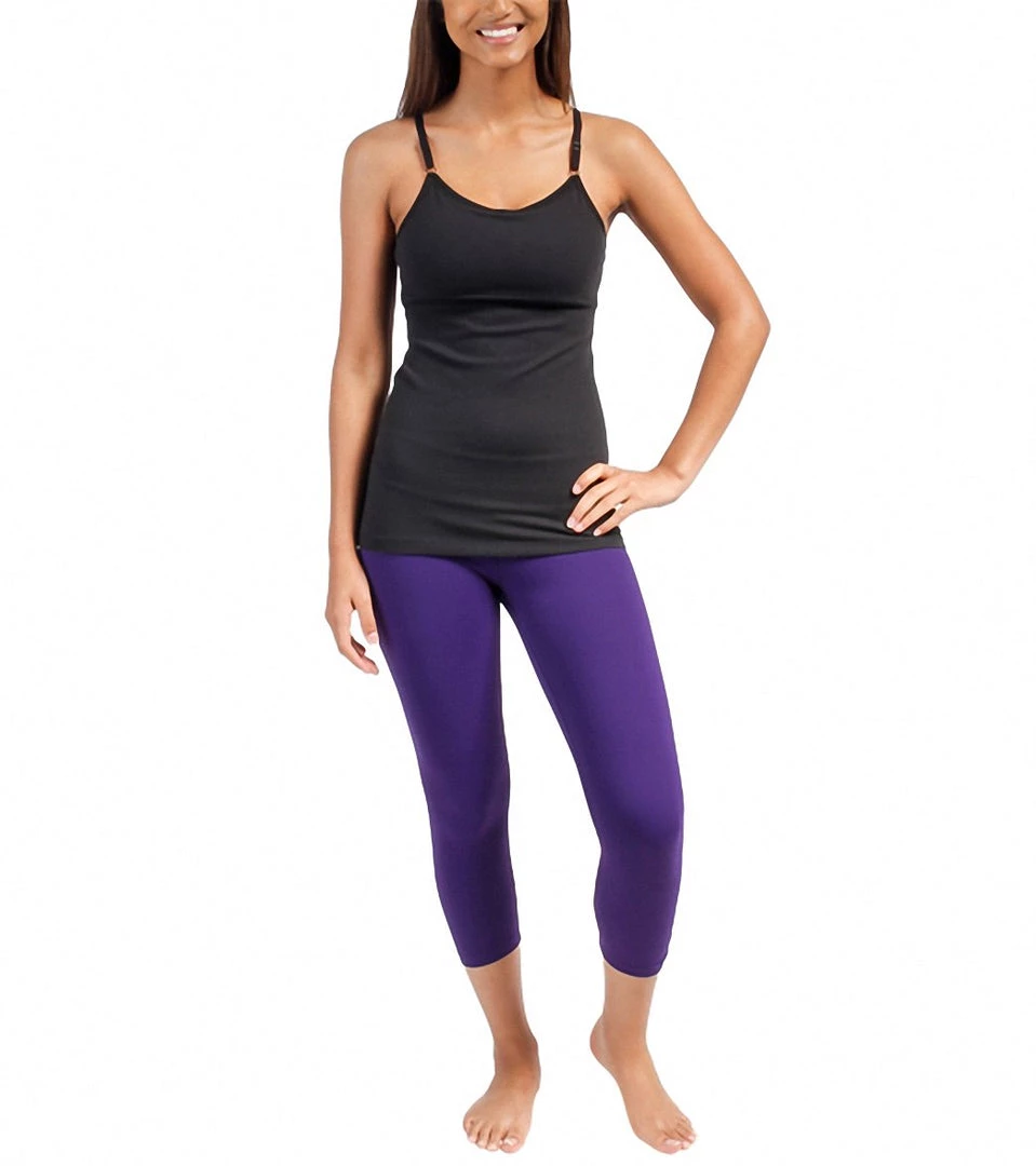- Keywords: tank top, cami, camisole, lattice back, adjustable straps, moisture wicking, quick drying, stretch, shelf bra, black, purple