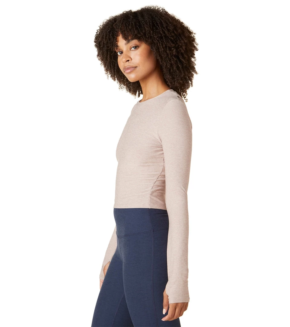 Plans can overlap when you’re wearing the Beyond Yoga Overlap Long Sleeve Cropped Pullover, a stylish choice with a triangle back cutout that will carry you from workout to play.