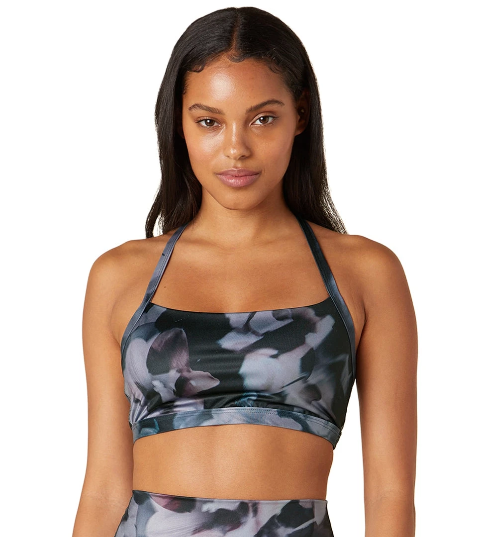 Dark and dreamy, the floral print on the Beyond Yoga T-Back Luxe Bra elevates this modern active bra, perfect for more pensive poses and deeper thoughts.