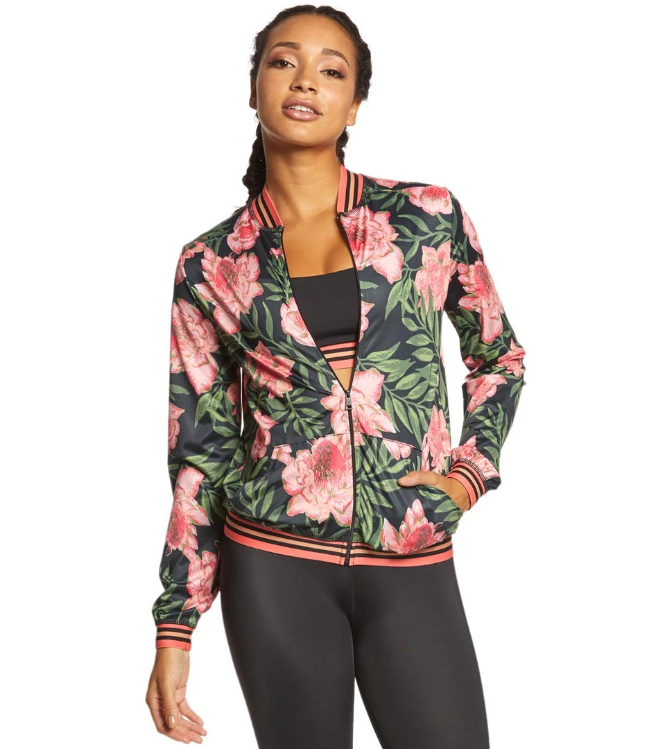 Show off your true fashion in the Beyond Yoga True Stripes Bomber Jacket. This bomber features an allover floral print with striped elastic at the collar, cuffs, and hem band for a versatile look you can sport to and from yoga.