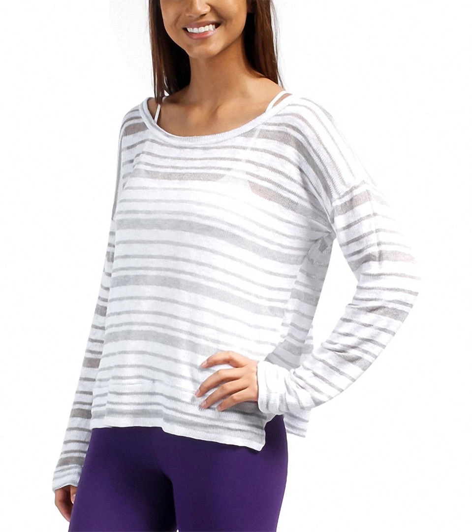 - Keywords: pullover, long sleeve, striped, scoop neckline, side slits, dropped sleeve, white, grey, sheer, lightweight