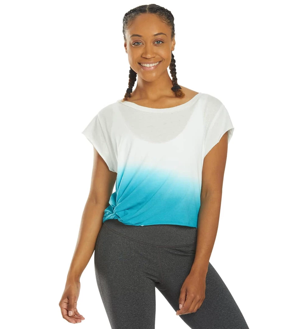 Take a dip in the Free People Hold It Down Dip Dye Yoga Tee, which features a bold blue contrast and slightly cropped hem with knot detail.
