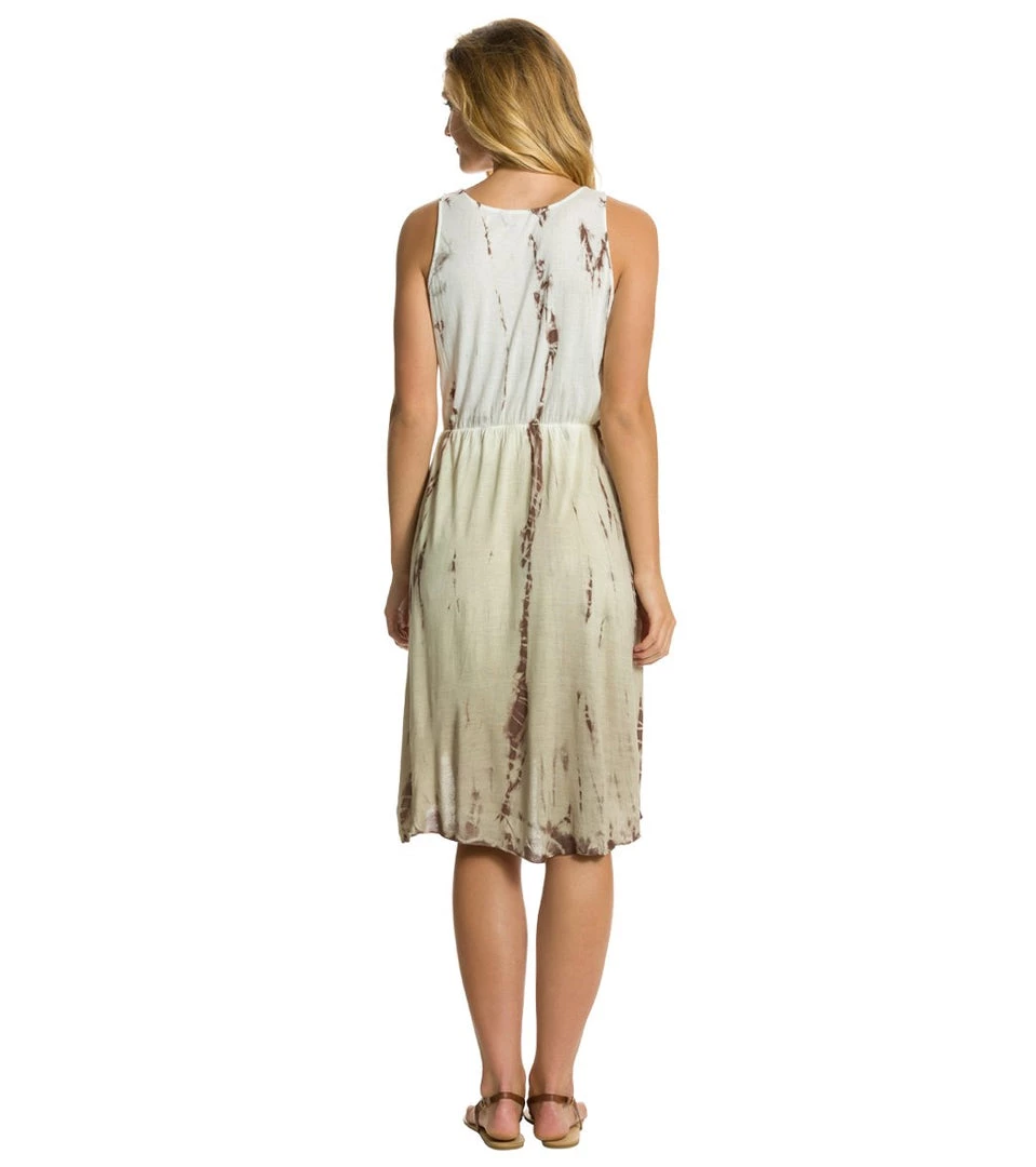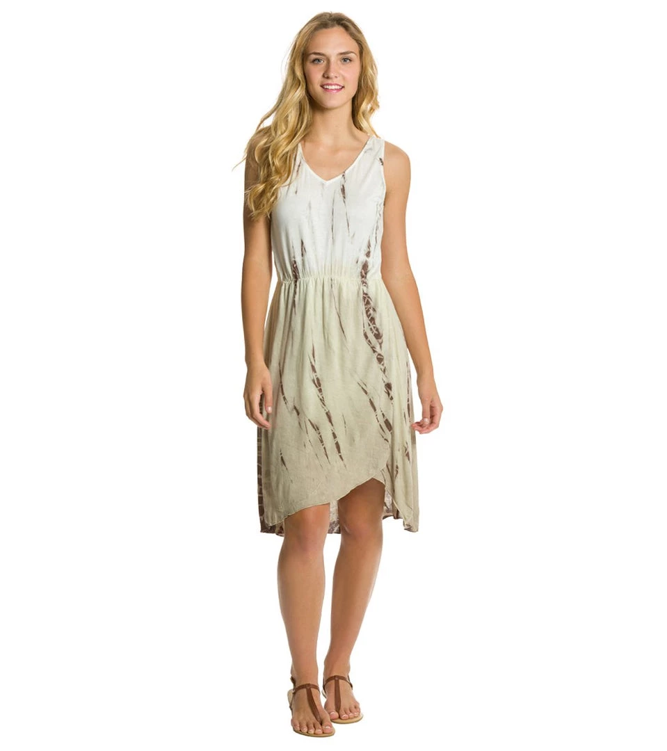 Front: hits above knee - Keywords: dress, short, tie dye, wrap, sleeveless, brown, white
