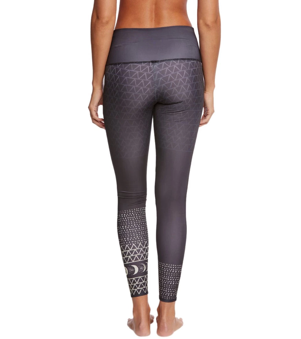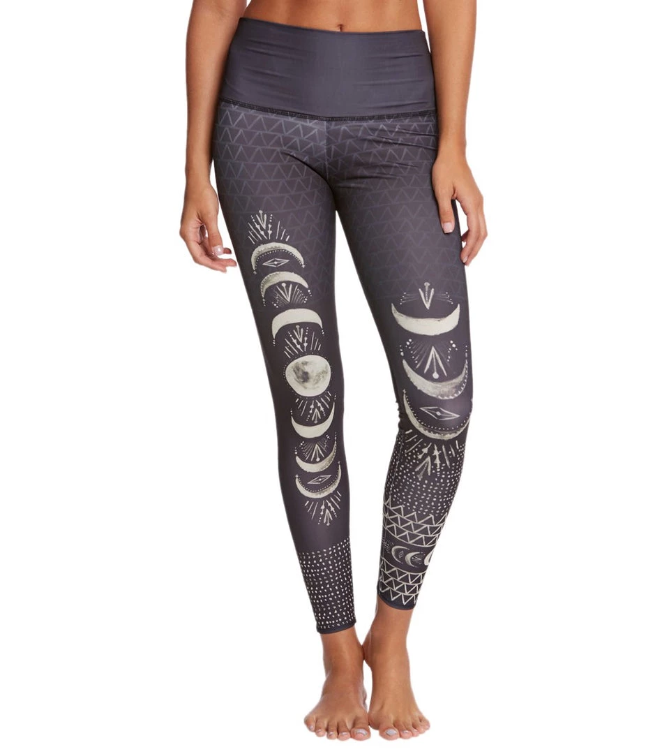 The Onzie High Waisted Graphic Yoga Leggings are a vintage throwback to fashion fitness. The high rise covers the hip area and lands just below the belly button for a comfortable, full-coverage fit.
