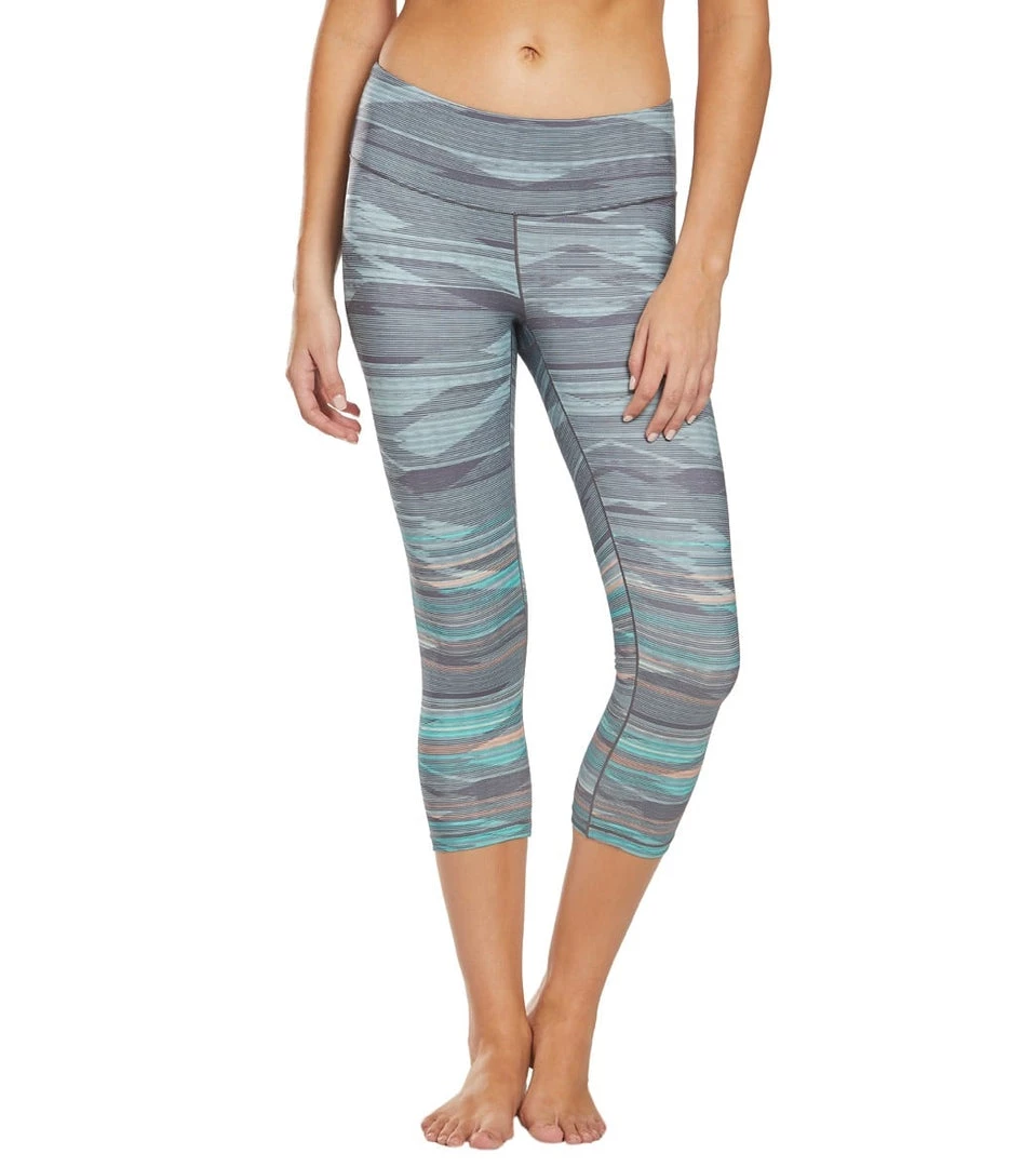 Step into these Prana Pillar Printed Yoga Capris for a comfortable practice. Made with recycled polyester fabric, these performance capris include moisture-wicking technology to keep you cool as you sweat. Its wide, mid-rise waistband hugs your lower stomach, while the triangle gusset adds comfort and reinforcement.Â