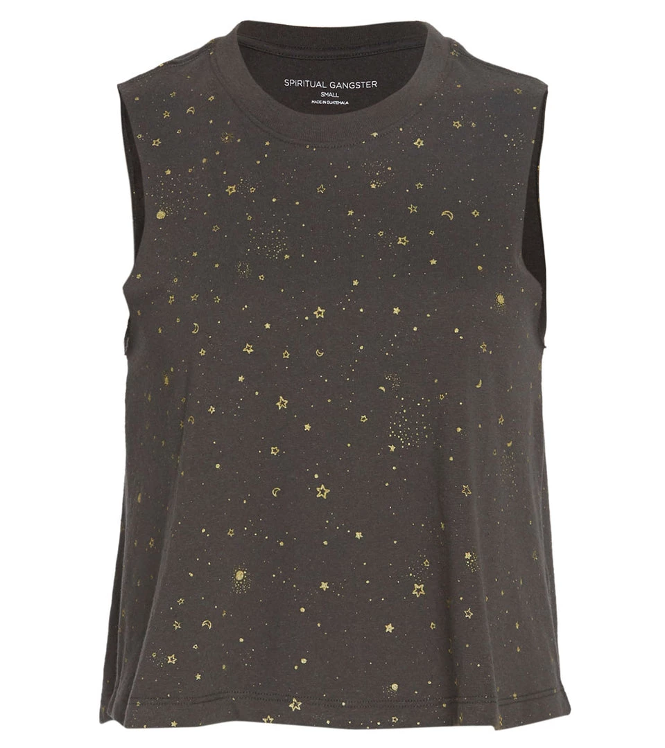 Shimmer on down in the Spiritual Gangster Crop Yoga Tank. Has an all-over celestial print in gold foil and a crop tank silhouette. Made with a super soft tri-blend jersey to keep you comfortable during your sweat session.