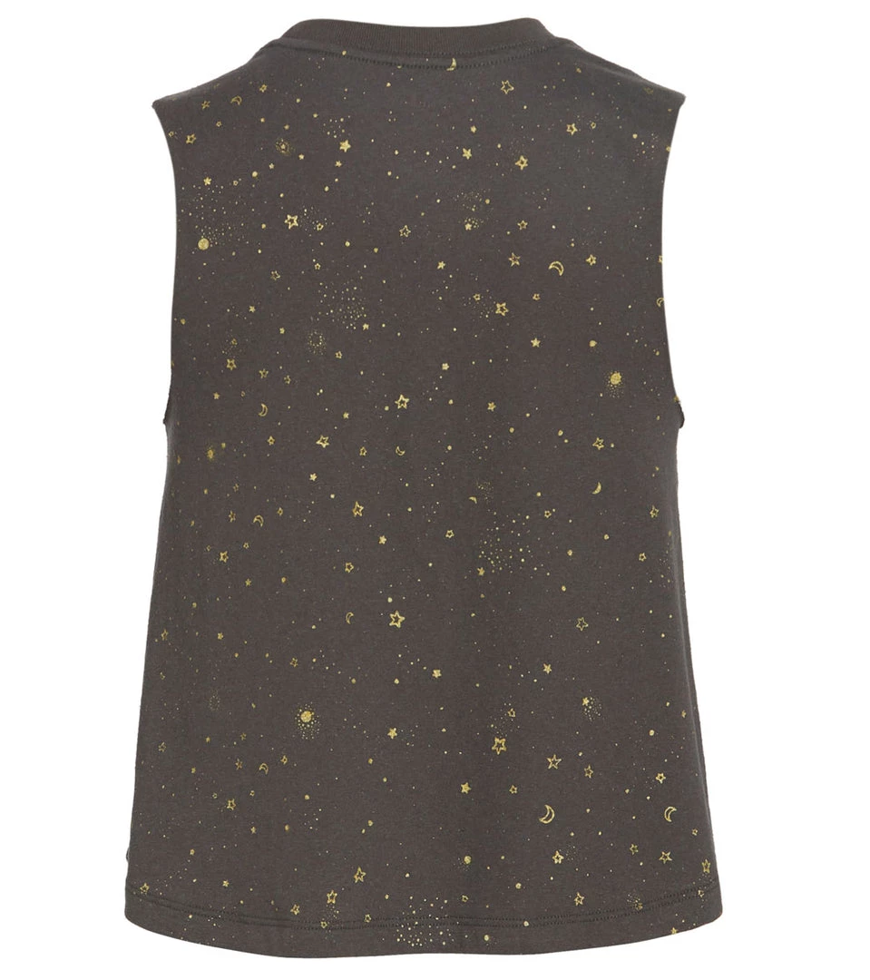 Shimmer on down in the Spiritual Gangster Crop Yoga Tank. Has an all-over celestial print in gold foil and a crop tank silhouette. Made with a super soft tri-blend jersey to keep you comfortable during your sweat session.