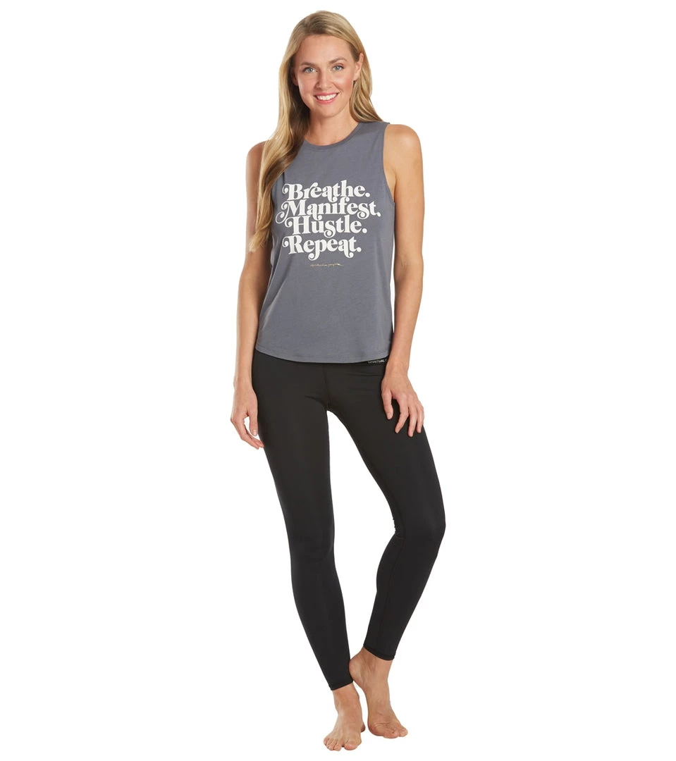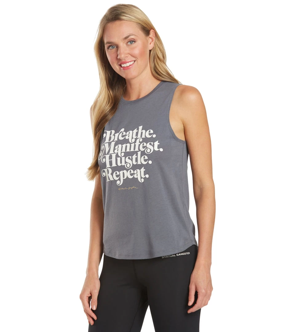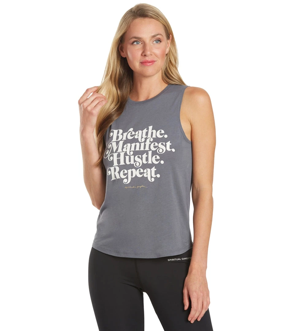 - : Muscle tank. Slim fit. Slightly dropped armholes. ”Breath, Manifest, Hustle, Repeat” graphic. Hip length.