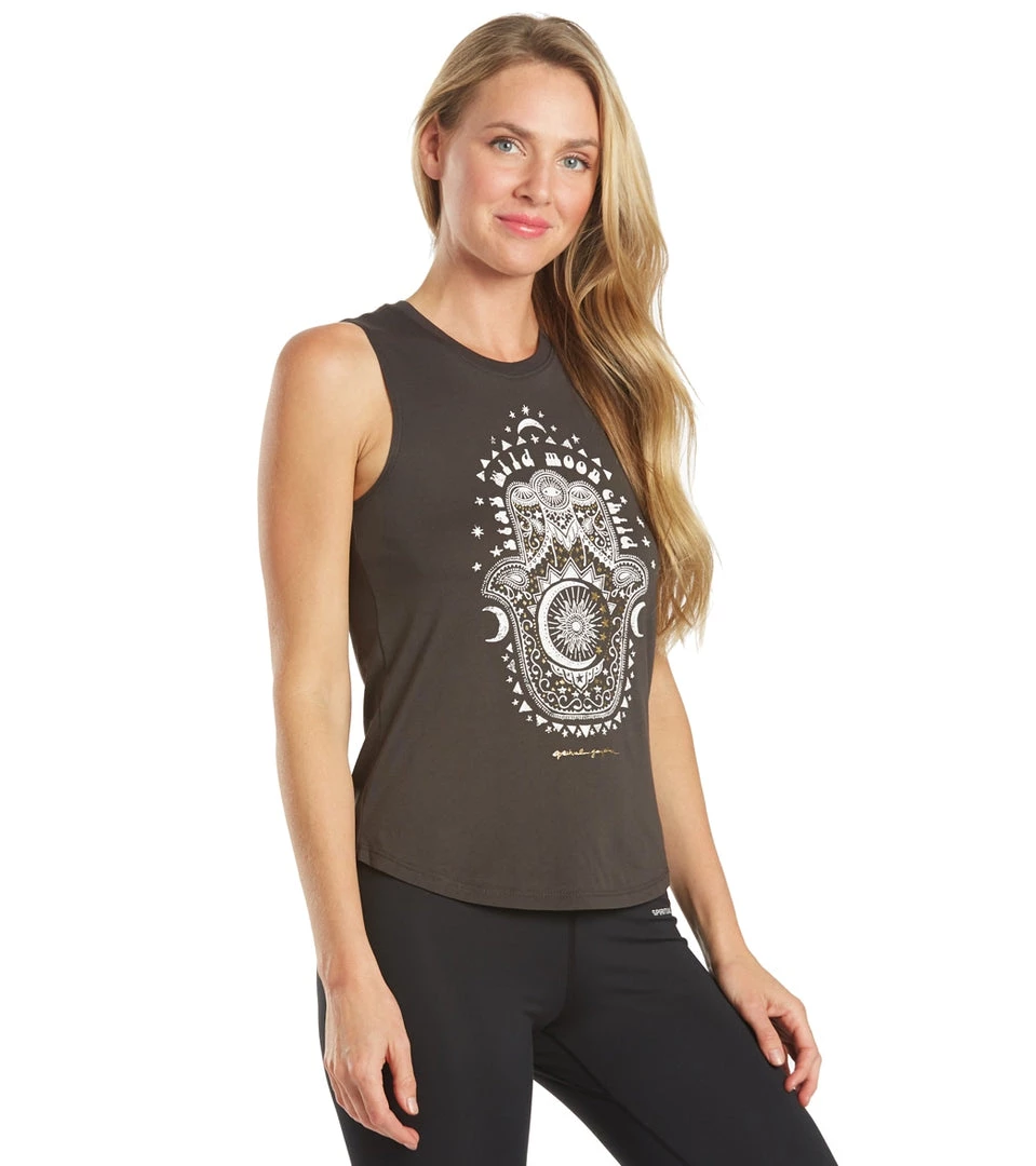 - : Muscle tank. Slim fit. Slightly dropped armholes. Tarot card inspired graphic with cosmic and hamsa print.