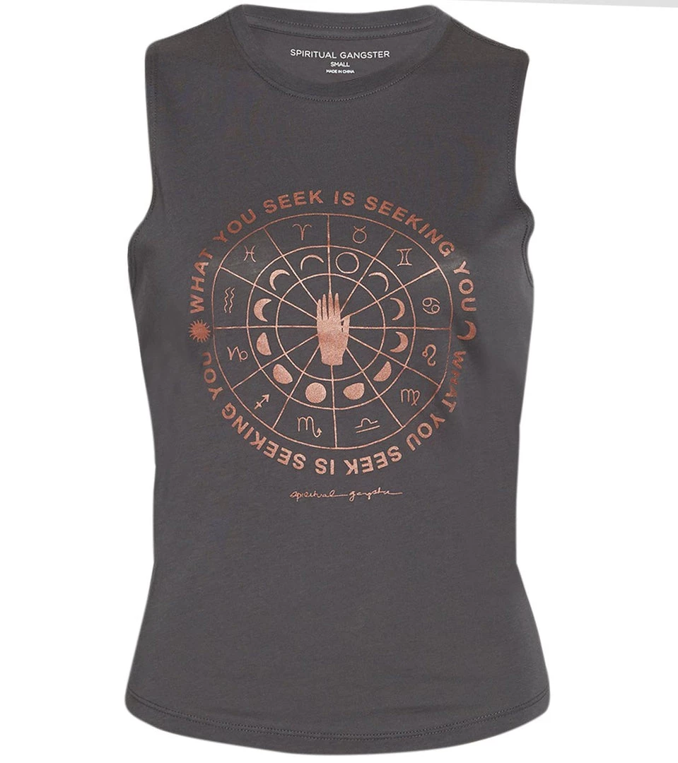 The Spiritual Gangster Seek Muscle Tank is everything you have everything wanted in a top! Features an astrological graphic on the front in a rose gold foil. Designed with a lightweight fabric to increase breathability, making this tank a great option to wear during your workout.