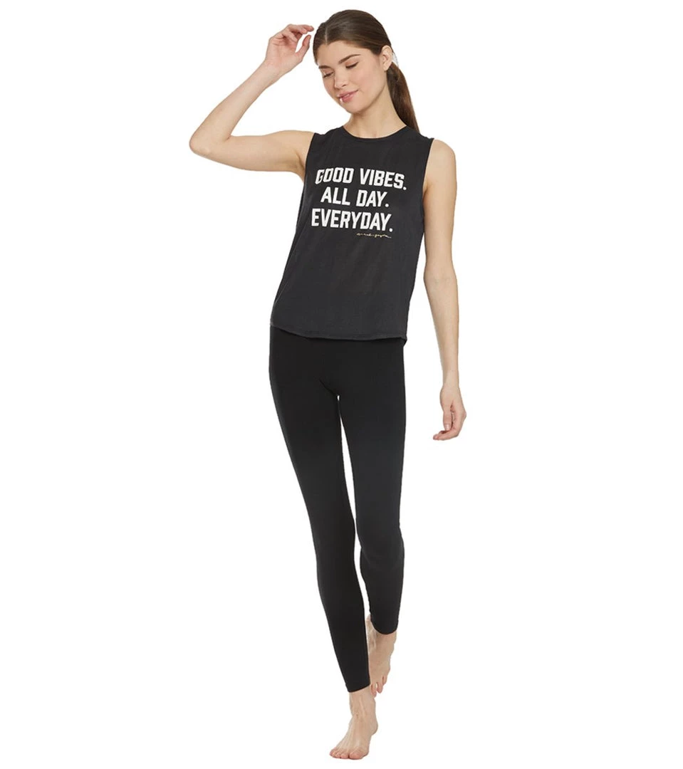 - Classic crew neck muscle tank with a “Good Vibes. All Day. Everyday.” graphic.