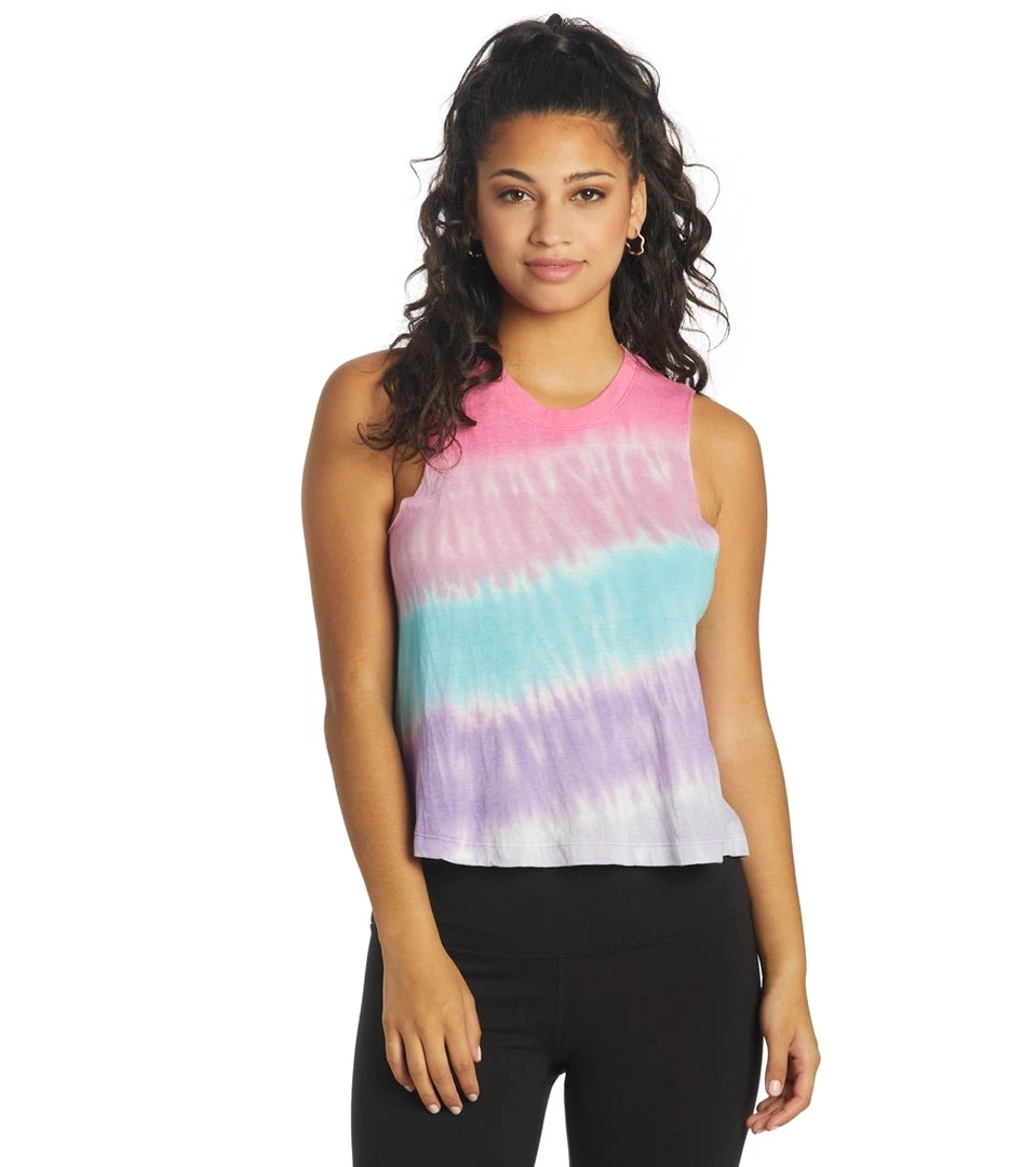 - : Tank top. Tie dye. Crew neck. Cropped.