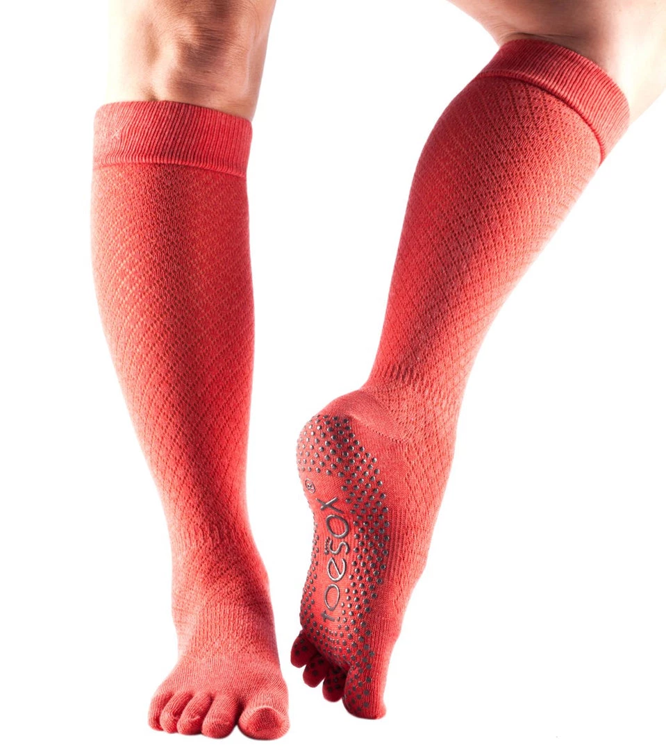 Toesox Knee High Scrunch Full-Toe Yoga Grip Socks Fishnet Poppy