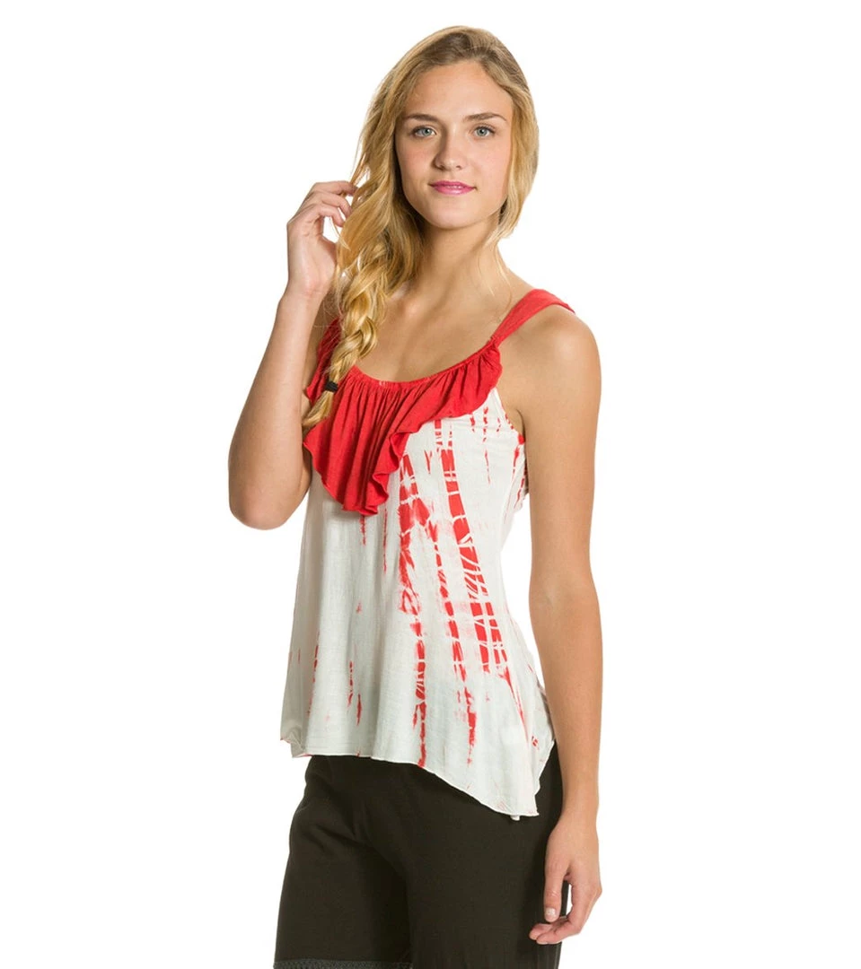 - Keywords: tank top, tie dye, ruffle, white, purple, lavender, coral, red